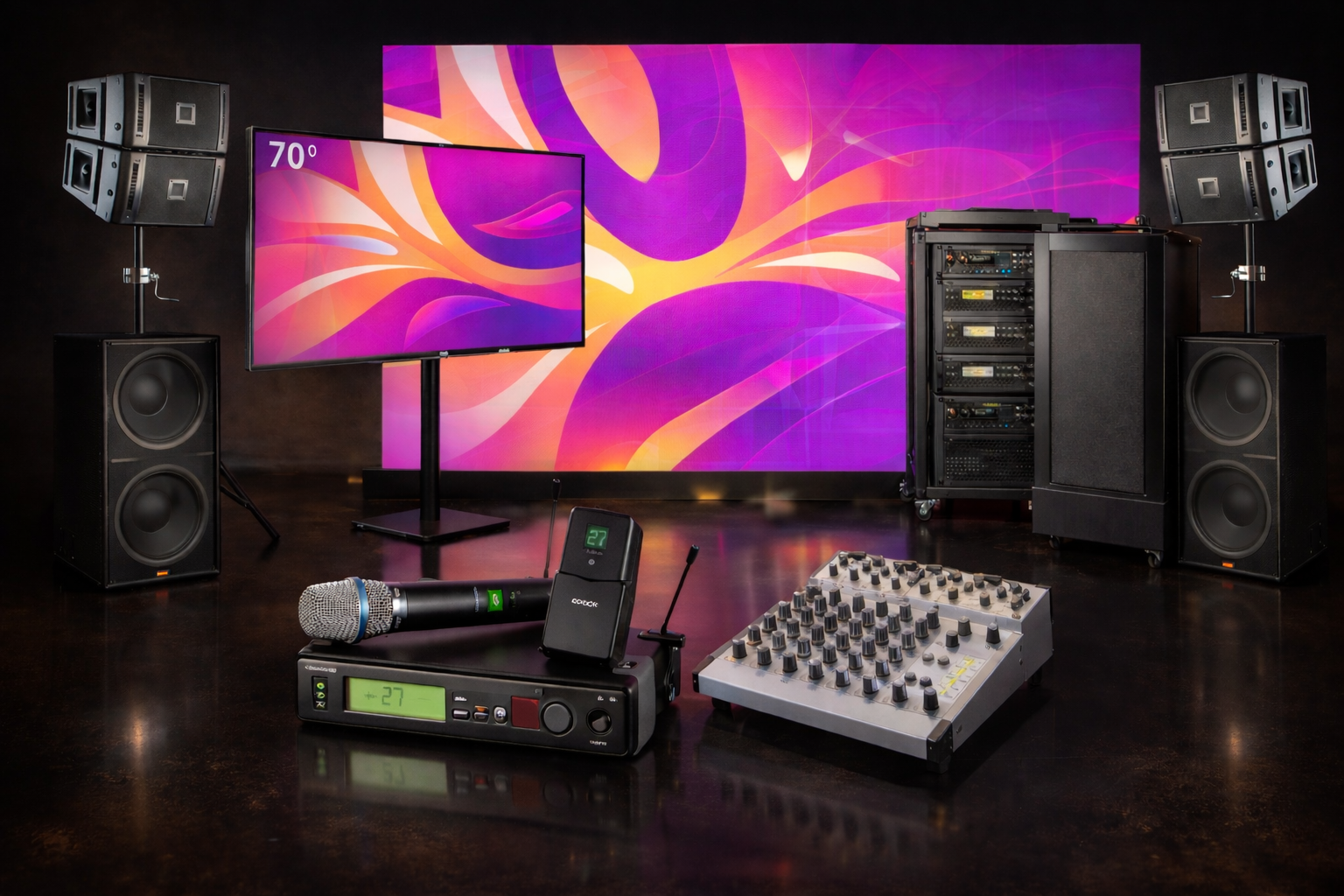A complete presentation bundle combining a display screen, wireless microphone and PA speaker system.